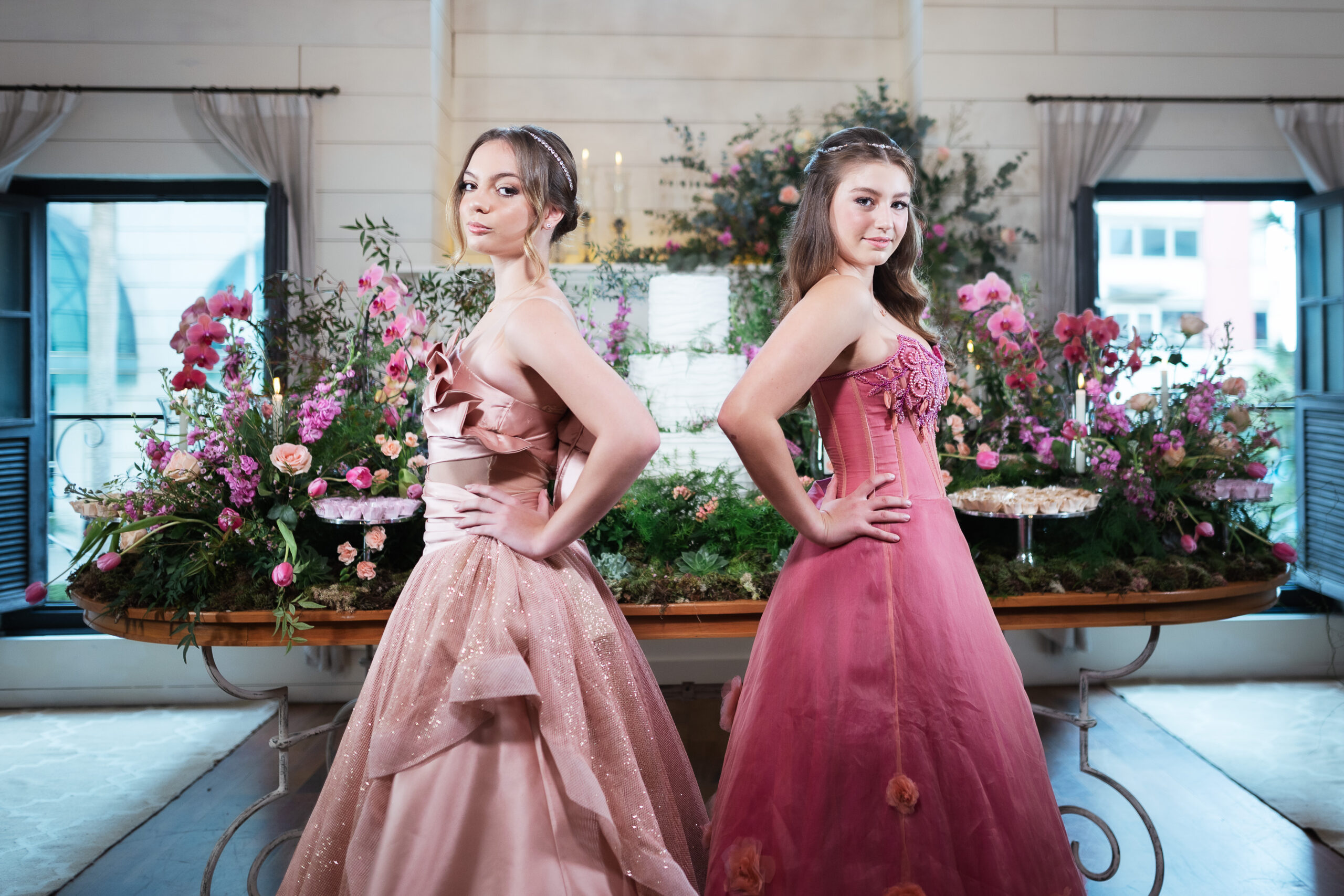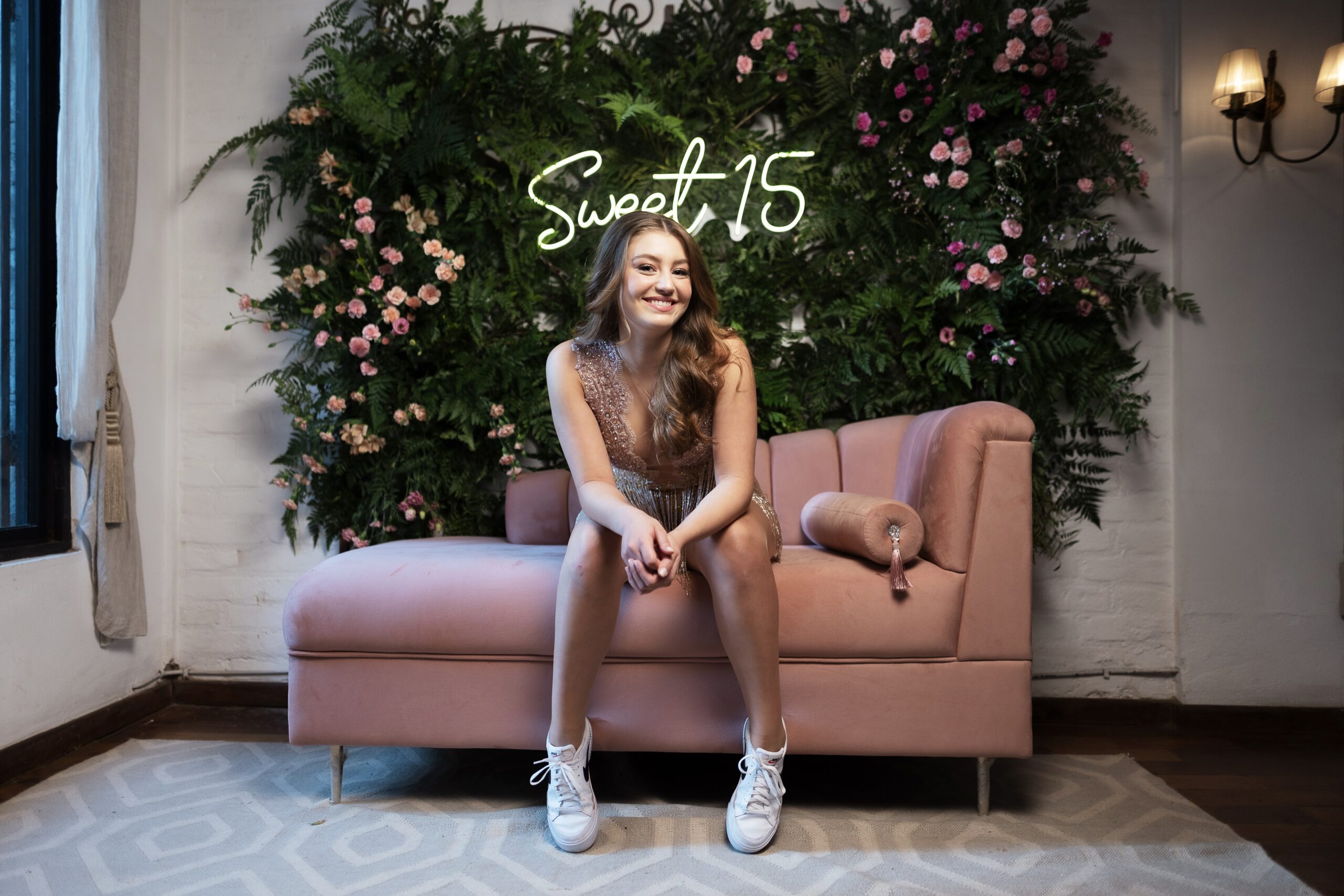 O quarto da debutante é espaçoso, com decoração exclusiva, climatizado e cheio de detalhes. Além de ser o local onde podem se arrumar para a festa, a aniversariante e suas convidadas podem relaxar enquanto observam, através de uma grande janela, tudo o que acontece nos ambientes da casa e na pista de dança.